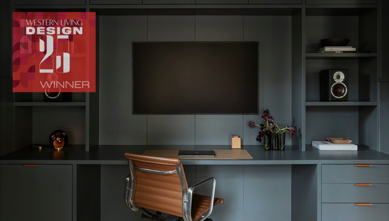 Some rooms are built for productivity; this one is built for exhaling. Sophie Burke and Nicole Gomes from Sophie Burke Design turned the Wallace House den into the kind of moody little cocoon that makes you instantly lower your voice, like you’ve stepped into a very chic secret. Wrapped in a smoky blue-grey and anchored by precision-built millwork from Precisionwerkz, the space tucks everything neatly in, vinyl, AV equipment, books, so the mind can settle as easily as the room’s palette.