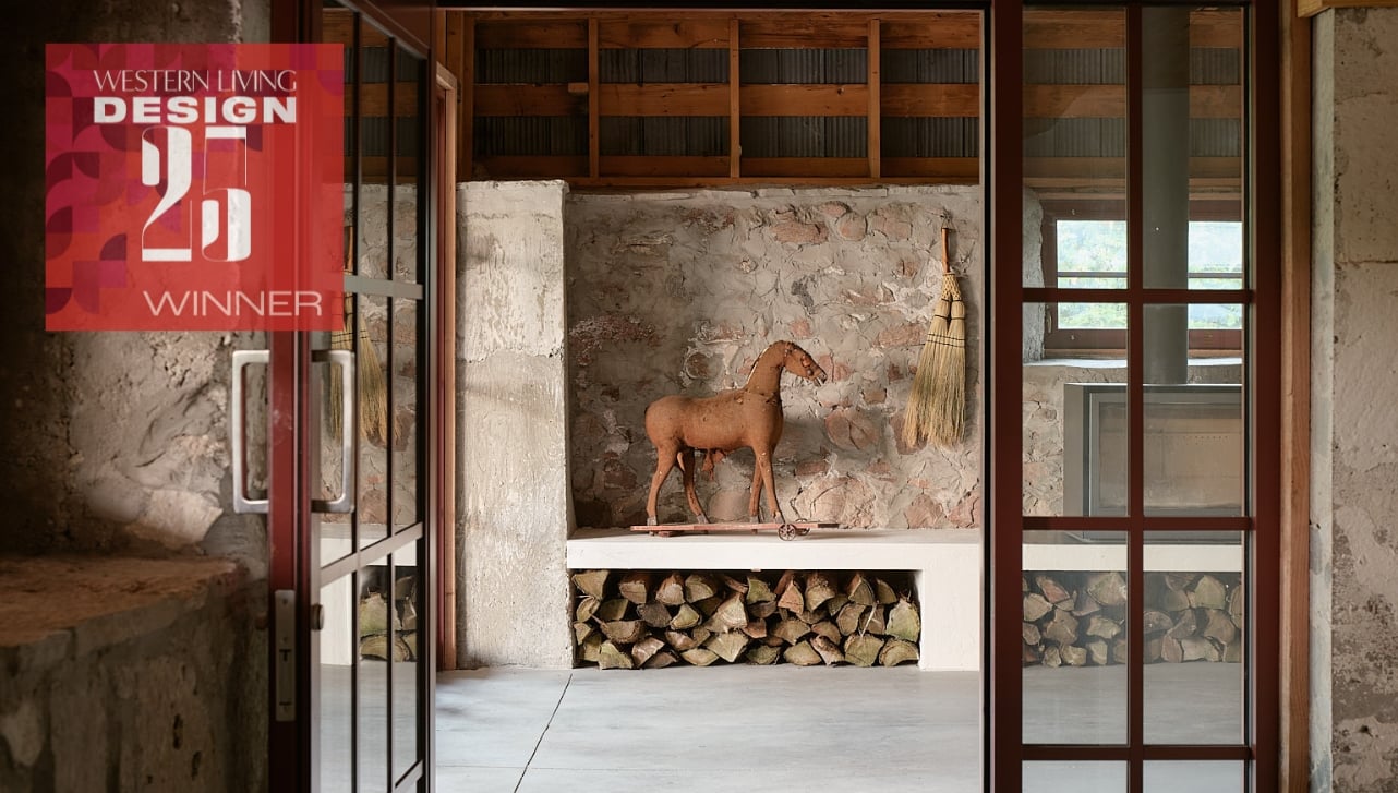 Travel an hour from downtown Toronto and you’ll find yourself in farm country. And if you’re lucky, you’ll experience said farm country from the comfort of this particular former horse stable, located on a 65-acre agricultural site in the small village of Kendal. Quietly luxurious but still imbued with rustic charm, The Barn is an event space shaped by Vancouver design studio &Daughters (winners of our 2025 Robert Ledingham Memorial Award). Principals Darcy Hanna and Emma Sims restored the 1930s livestock barn and added bathrooms, a bar and a commercial kitchen, guests can assemble in the inviting concrete-and-stone foyer to lounge on the built-in sofa or warm themselves by the Stuv wood-burning stove, before ascending an Ontario pine staircase to the hayloft. Glass-paned metal swing doors connect that entryway to the covered courtyard, which in turn connects the space with the meadows below; thoughtfully sourced local antiques peppered throughout, meanwhile, help connect it all to history.