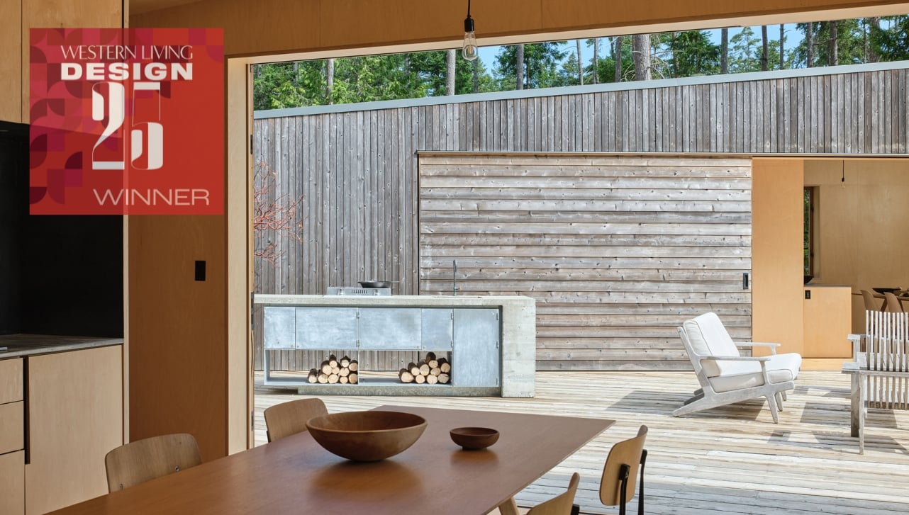 Open-air kitchen and sliding walls connecting shared family wings at Cabin 1+1, Galiano Island
