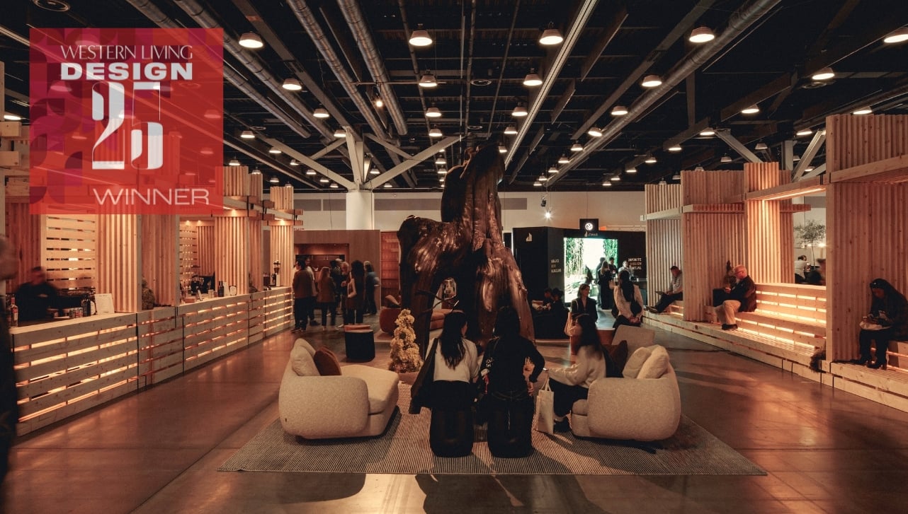 If you attended IDS Vancouver this past fall, you likely found yourself drawn to the impressive structure that made up the central bar (whether to admire the architecture or just to delight in a show that involves socializing with a glass of wine). Built entirely without fasteners or waste, In/tension was a temporary bar and bench installation using stacked lumber entirely held together with ratchet straps and relying on the inherent friction of the wood surface to create structural stability. Designed by architects Paul Koopman and Jessica Yarish, it was both a structural marvel and a space for moments of delight: Bjorn, a sculptural creature by artist Brent Comber that was born from a felled tree, stood among the timbers to keep guests company as they relaxed on the benches within the structure, and, speaking of delightful, every piece of lumber was reused once deconstructed at the end of the show.