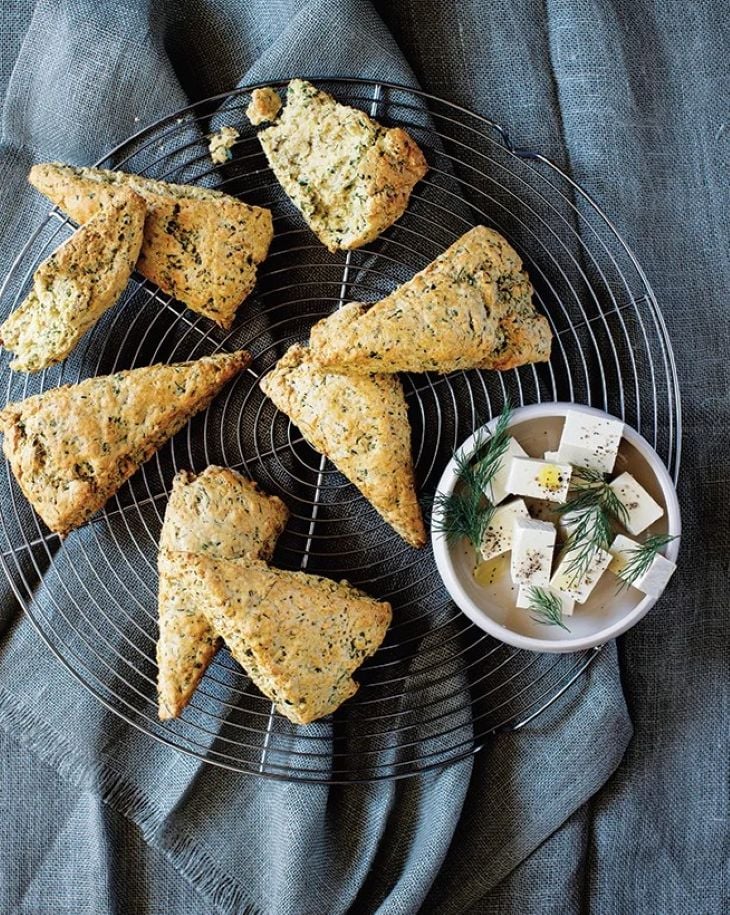 Since this plant-based recipe uses neither butter, cream nor eggs, these have a unique texture; they’re not as crumbly as a British scone or as crumbly as an American biscuit. Of course, that doesn’t make them any less delicious—the soy milk, maple syrup and olive oil glaze is the perfect complement to the macadamia feta and herb filling.