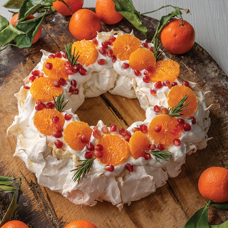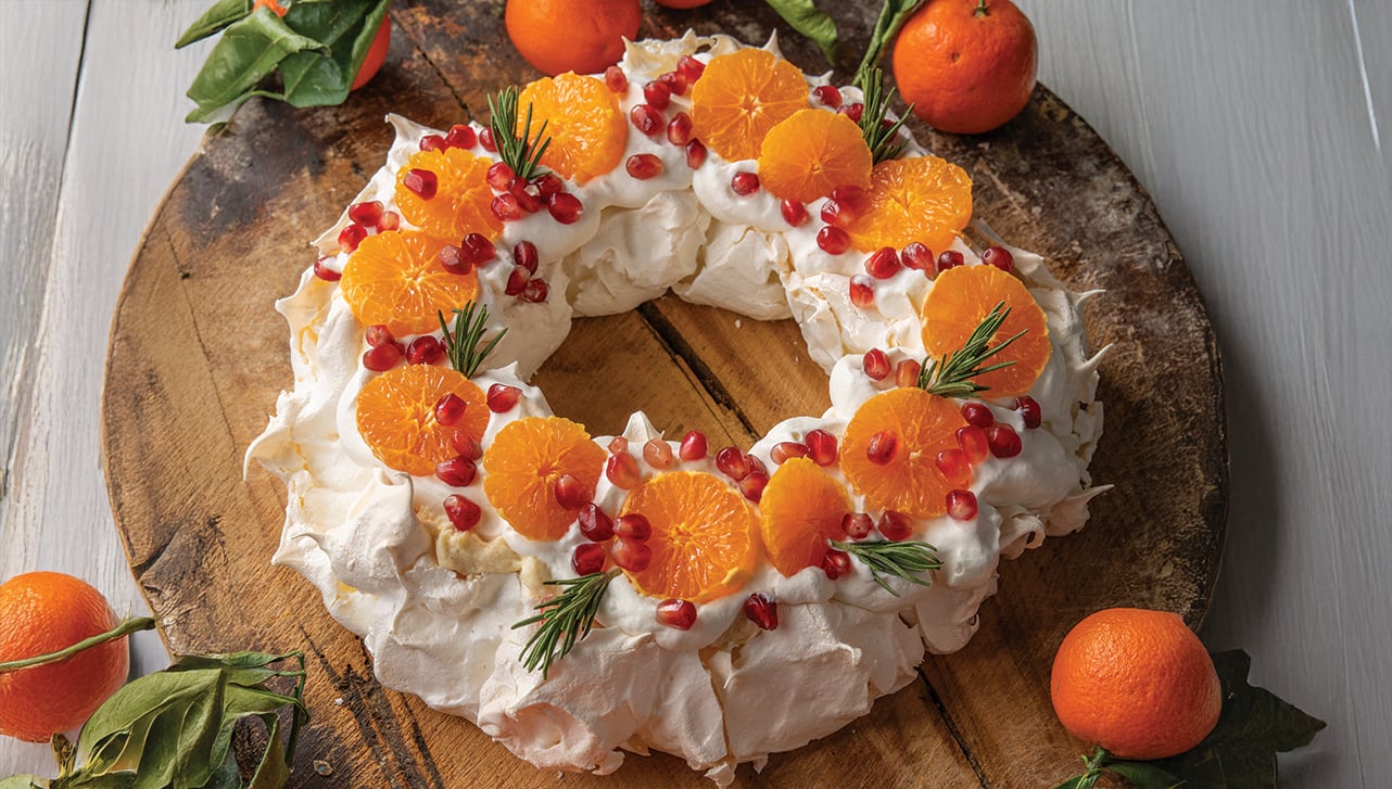 Once ready to serve, place pavlova on serving dish and carefully spread softened cheese mixture on delicate pavlova top. Add whipped cream and decorate with mandarin orange segments, pomegranate seeds and rosemary. Slice and serve.