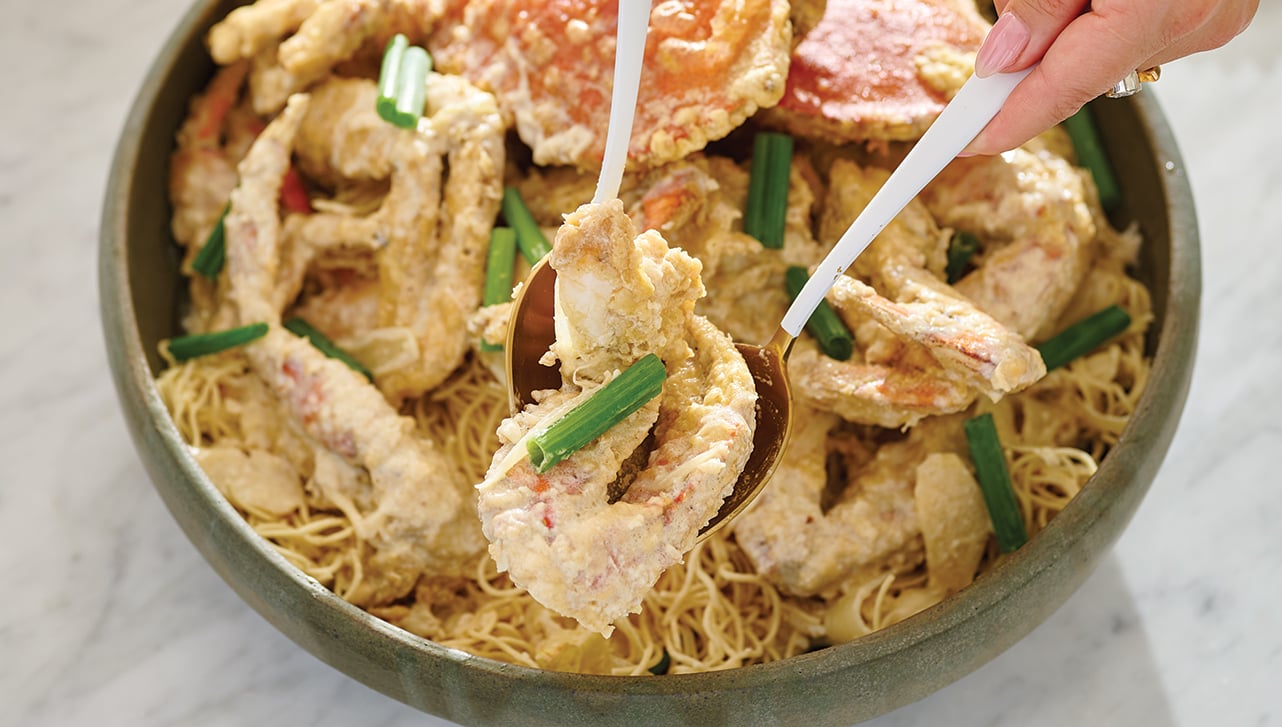 7. While crab is simmering, in a medium pot, boil 2 litres of water. Add 1 tsp oil and the egg noodles, spreading the strands as you submerge the noodles so they do not stick. Cook for 1 to 2 minutes or until al dente. Rinse and strain in cold water.