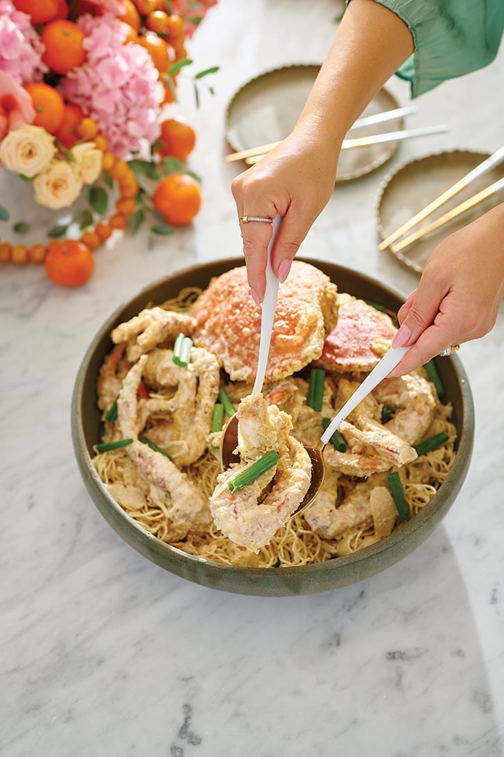 8. Transfer egg noodles to a large serving platter, style the crab and sauce over top and enjoy!