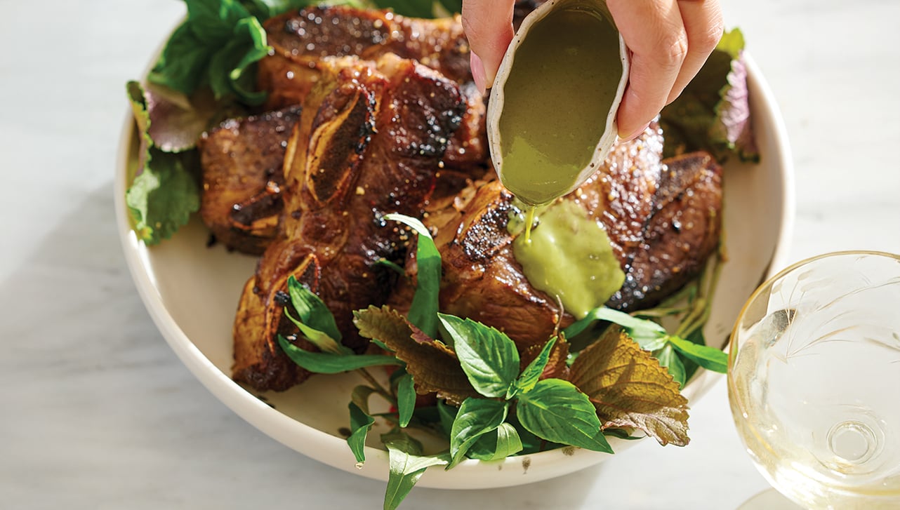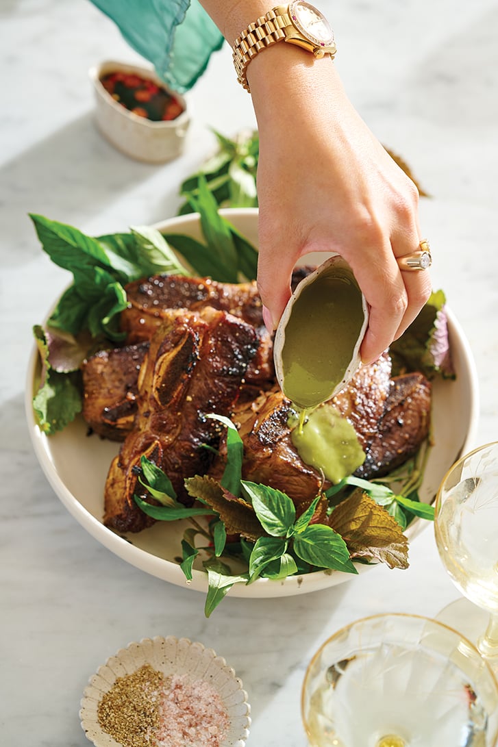 Remove from heat and let short ribs rest for 6 to 7 minutes, loosely covered with foil. Slice against the grain and serve with Vietnamese herbs, the sweet soy and the bird’s eye chili for guests who like it saucy!