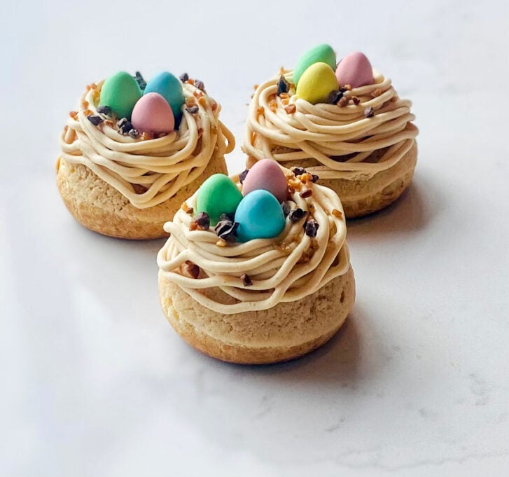 Ready to do some Easter baking? Mini Egg Cream Puffs are an eggs-cellent way to celebrate the Easter weekend. Crisp choux pastry is filled with vanilla pastry cream and topped with a chantilly nest of Mini Eggs. It’s chocolatey, crunchy, silky and super adorable!