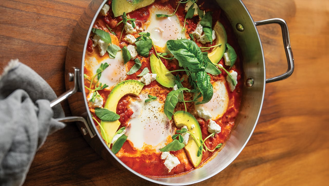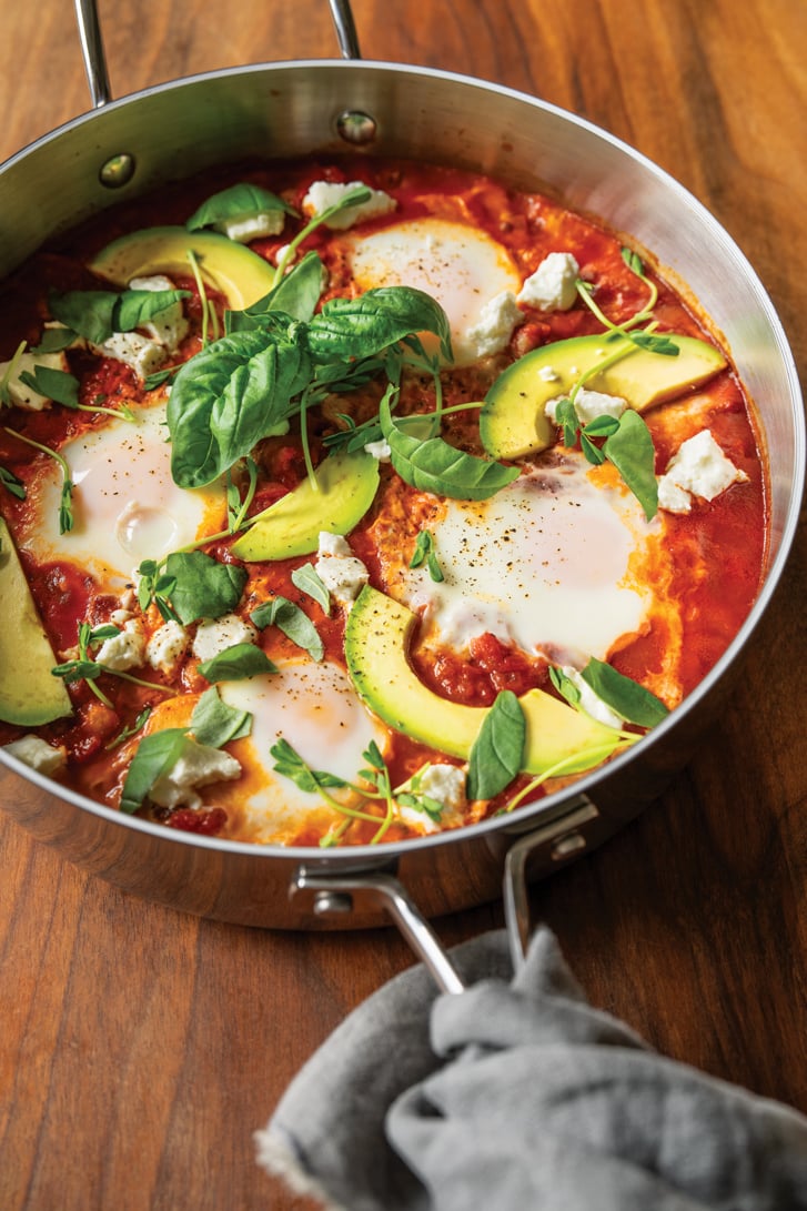 Gently crack eggs into individual ramekins. Using the back of a spoon, make wells in the sauce for each egg, then pour in one at a time. Cover skillet with lid to create steam and cook eggs for 5 to 7 minutes for soft-poached texture. Stay close and watch carefully to avoid overcooking. Once eggs are cooked, sprinkle with feta and basil, top with diced avocado and finish with olive oil drizzle.