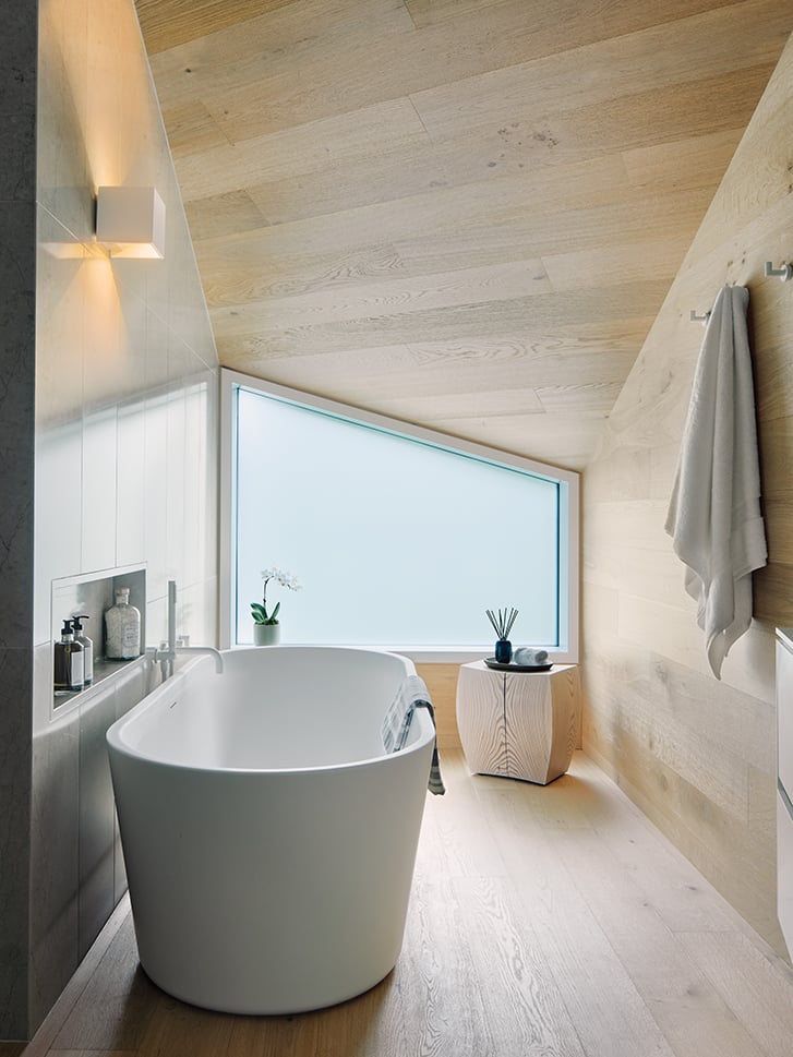 Sure, designer Juli Hodgson could’ve redesigned this unique bathroom into a neat and tidy linear volume—“squared the rhombus,” if you will—but where would the fun be in that? “We let the shape of the room lead the design,” explains the president of Vancouver’s Hodgson Design Associates. “Everything else was secondary.” So this Whistler home, designed by Vancouver’s BattersbyHowat, doesn’t try to distract from the dramatic angled ceiling: it celebrates it, highlighting the jaunty slope with variegated boards of Pure Brushed white oak by Hakwoods.