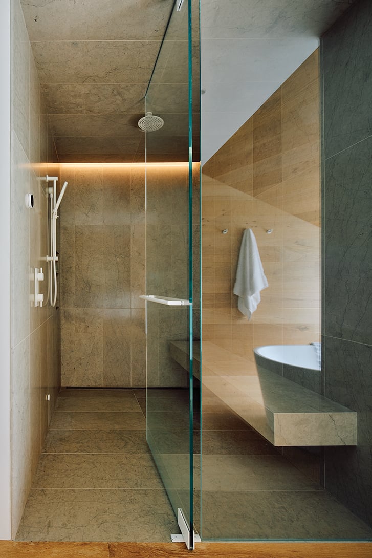 The large steam shower is lined with Loire natural stone from Stone Tile, and outfitted with a bench long enough for a lie-down (“and benches are always functional for shaving your legs,” adds Hodgson).