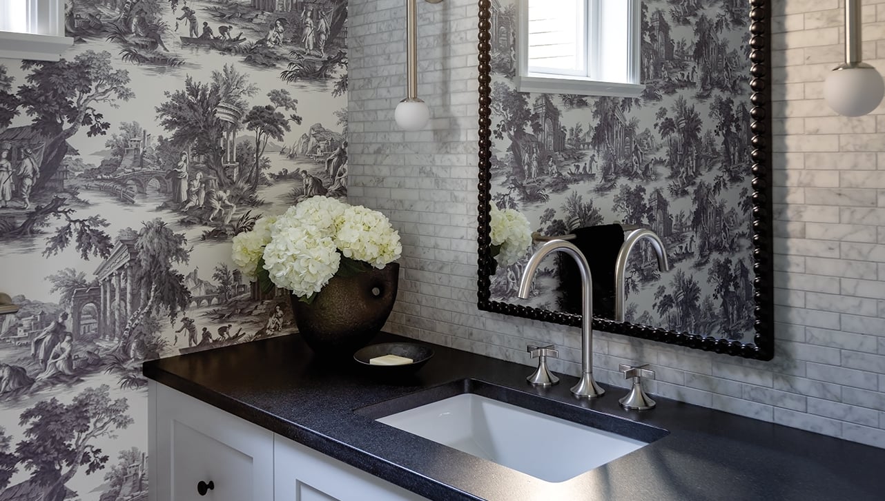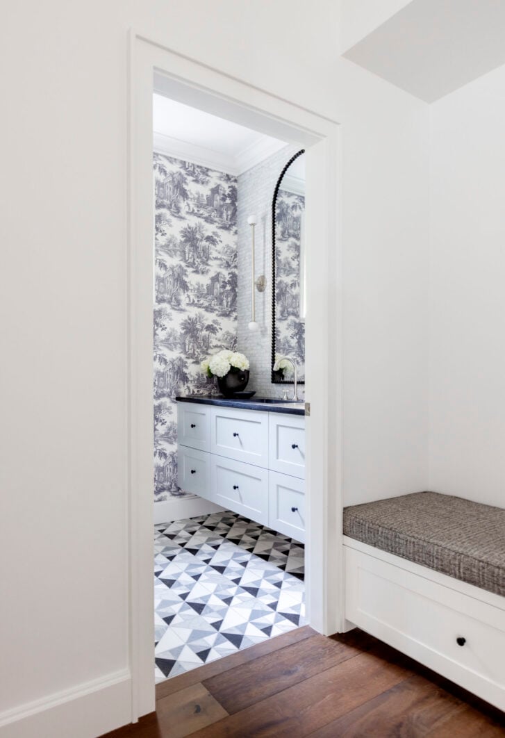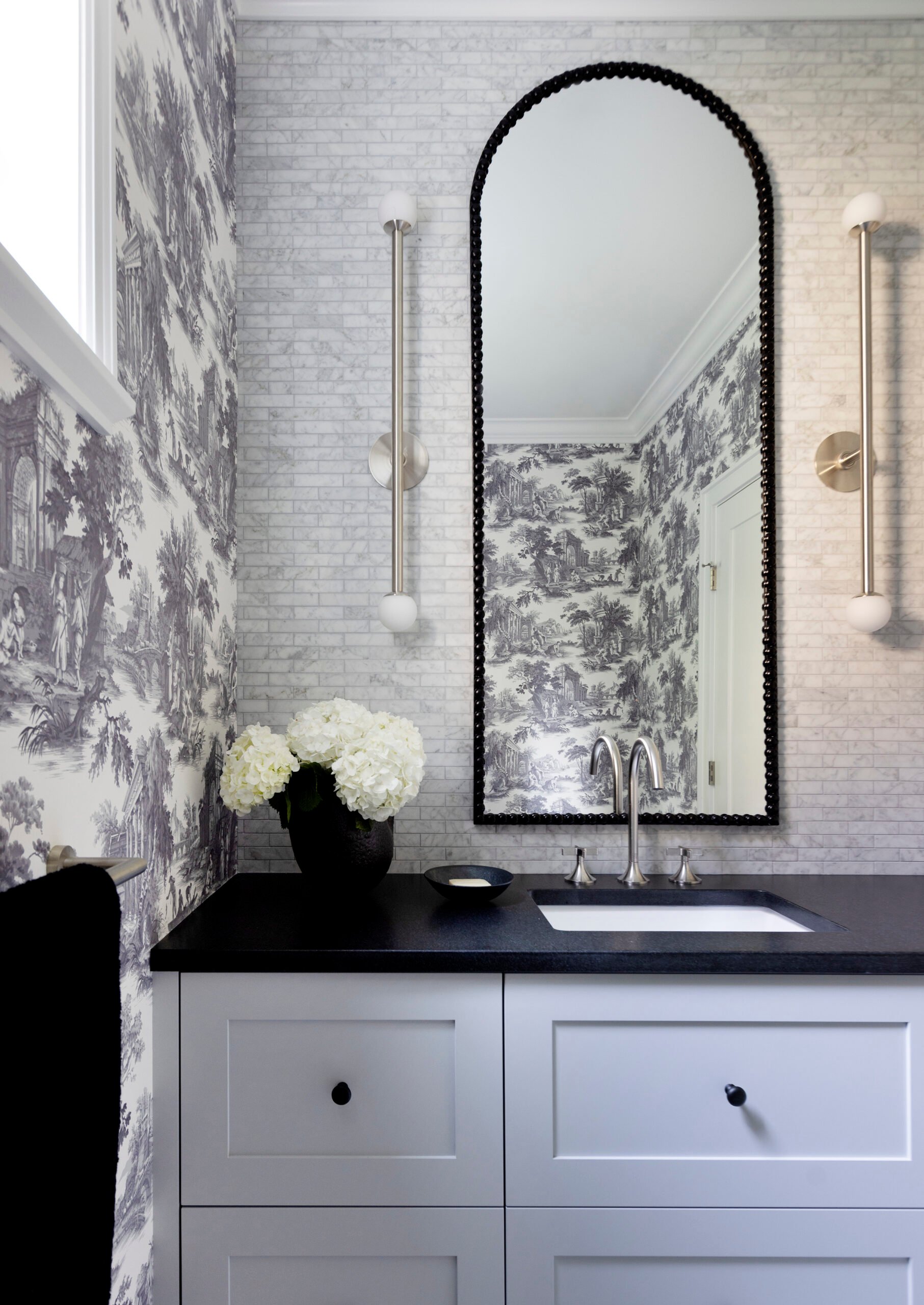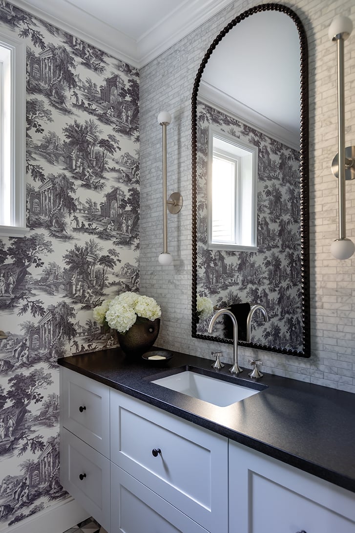 The powder room in question was compact in width and depth, but featured lofty nine-foot ceilings. He filled the space with contrasting design sensibilities, using a palette of greys, charcoals and black in a layered concept: French toile wallpaper meets geometric tile flooring while a pair of brushed nickel sconces on either side of a long mirror give way to unexpected vertical drama.