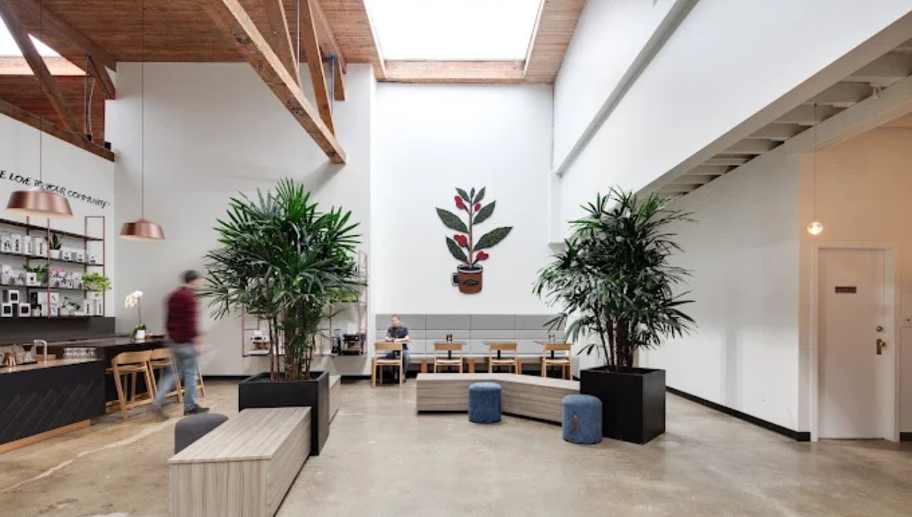 Vancouver designer Alice D’Andrea has been brewing Pallet Coffee locations since 2016, but Pallet Coffee HQ in Railtown is her biggest project yet. The vision for the space was part roastery, part retail. Unlike the other locations, which focus solely on retail, Pallet HQ has concrete walls, high ceilings, and plenty of natural light€”a far cry from the cozy, dark roast vibes of the other shops. “Railtown is where they do the roasting, so we wanted to make it more of a hardcore design, something that is more bold,” says D’Andrea.