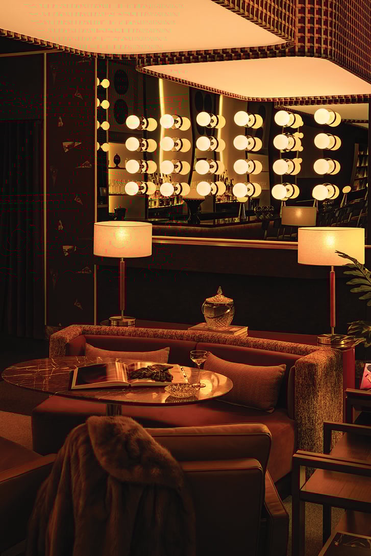 The globe lights on the mirrored columns give Mimi a cinematic vibe, and were inspired in part by old Italian movies (and the dressing rooms of stars). “It’s evocative of this sense of glamour and theatricality and cinematic ambience,” says Stanghetta. Photo by Conrad Brown