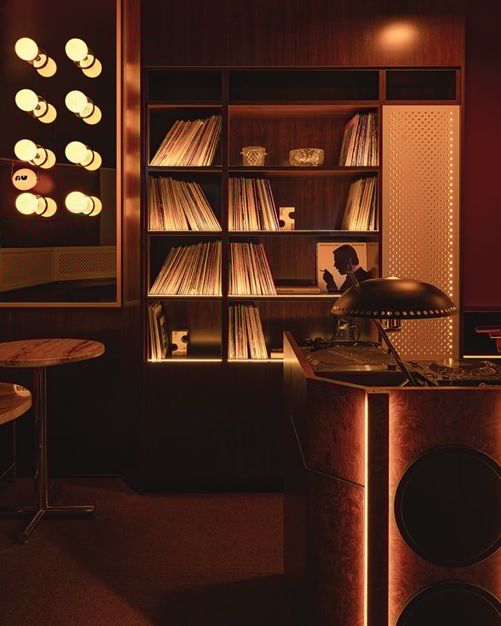 Mimi feels comfy and cool: plush patterned furniture gives this Edmonton bar a living-room vibe; there’s a projector playing art house films on loop, there’s live jazz on Sundays. Despite the spot feeling like an intimate and easygoing retreat, the aesthetic is possible thanks to rigorous and meticulous planning from Vancouver-based Ste Marie Studio. The room is one-third of a trio—Va, a daytime café serving paninis and pizzas, is on one side, and Olia, an Italian ristorante known for housemade pastas and a serious wine list, is on the other.