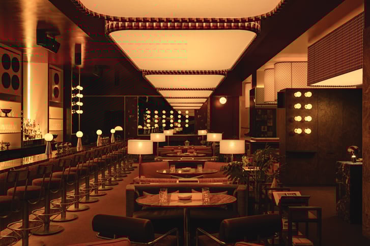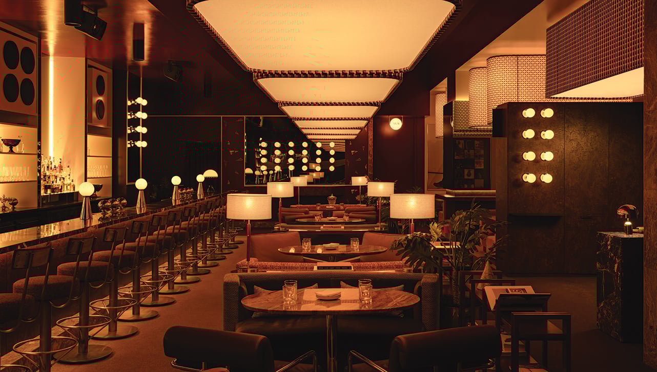 That identity is inspired by Milan circa the 1970s and ’80s. “I wanted it to feel very expressive of many different cultural outlets,” says Daniel Costa, chef and owner of Mimi (and Va, and Olia). Some references are obvious, like art that echoes director Federico Fellini’s work or a photograph of Italian film star Marcello Mastroianni. Then, there are the details that only a designer might pick up on: fabrics inspired by retro Italian suiting, scarves and dress patterns. Though Mimi is a commercial space, it feels more like an apartment, perhaps one by architect and designer Gianfranco Frattini. “It’s densely furnished, there is a lot of partitioning and lamping, the lighting level is super low,” says Stanghetta, “but it also gives you a lot of layers for your eyes to rest on; it’s done in a very residential way.”