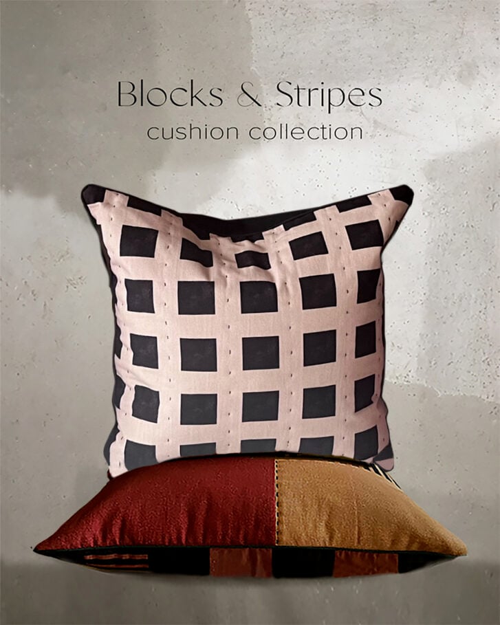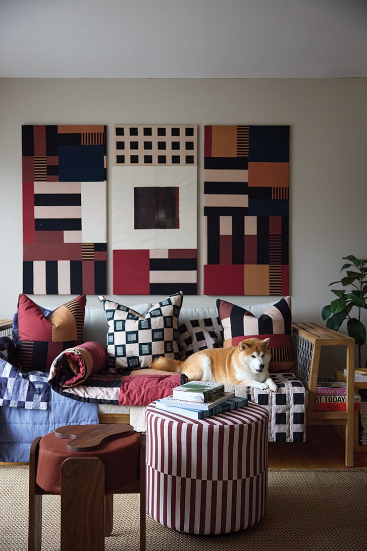 Four years on, she’s quietly becoming one of the West Coast’s most intriguing textile voices. Her West Van home studio practice has grown from solo experimentation to commissions with architecture firms and local clients. Her signature Block n’ Stripes collection—tactile, hand-printed geometrics in deep, saturated tones—nods to postmodernism, Bauhaus and Piet Mondrian, and to her dad, a leather-and-woodwork hobbyist who made her mother leather handbags and jewellery bags lined in purple velvet: “That texture stayed with me,” says Packer. It shows up in her quilted cushions, their hand‑finished stitches giving a tactile depth that turns fabric into story.