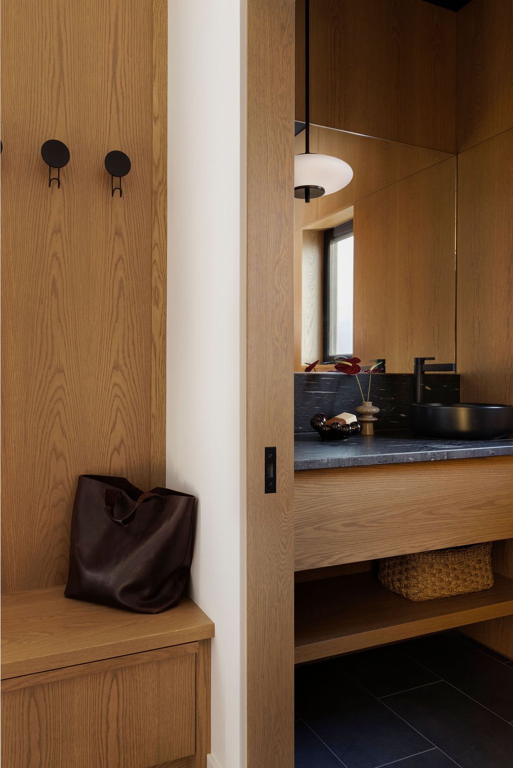 One of Boisvert’s favourite spaces is intentionally understated: “The simplicity of the entryway powder room. It’s just so beautiful as you enter the home and you’re welcomed with the warm wood paneling and the moodiness of the powder room.” Photo Credit: Mary McNeill Knowles.
