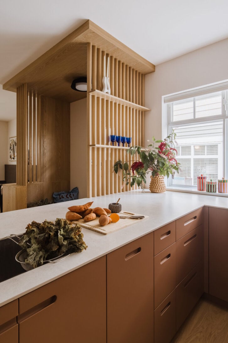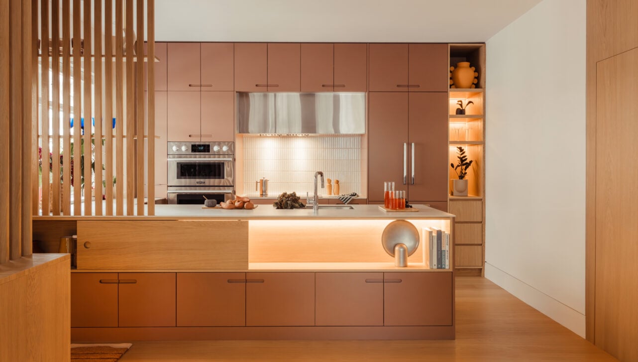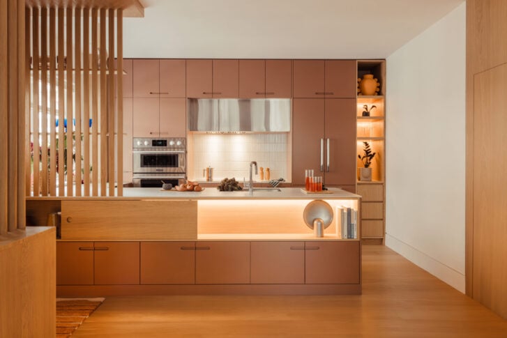 Admiring this Vancouver kitchen renovation by Andrea Jae Studio, you’ll likely first be impressed by the muted pink cabinets, custom half-barrel slat wall or clever sliding storage in the peninsula. But there’s a vital, if inconspicuous, design choice here that allows those star elements to shine. Literally. Studio principal Andrea Ewanchyna explains that the natural light from the kitchen window, dimmable LEDs in the built-in shelving and a soft white paint to reflect ambient rays coming in from the living room all keep the kitchen bathed in a warm, welcoming and bright glow. When her team, along with contractor Condoworks and millworker Millwerks, removed the wall that originally separated the kitchen from the rest of the home, they opted for the partial slat wall to create a foyer.