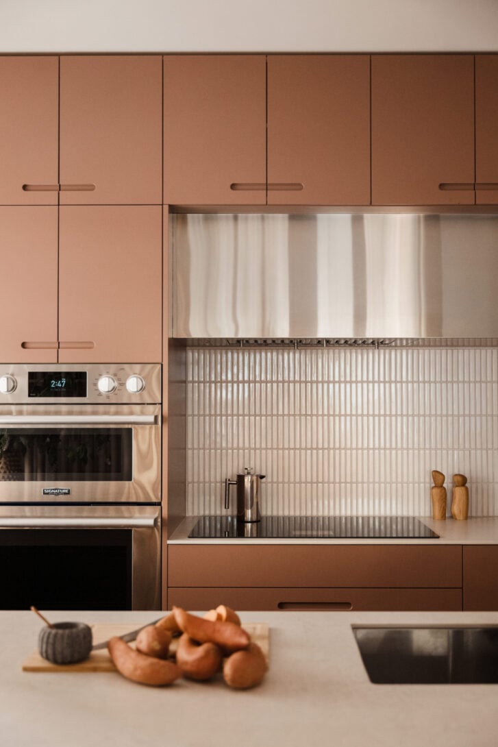 The cozy-coloured millwork is painted in Sherwin-Williams Mulberry Silk. It doesn’t scream pink, but it does add a gentle blush to an otherwise white-and-wood space. The “kit-kat” tile backsplash is Ames Tiles’ Nagoya in white.