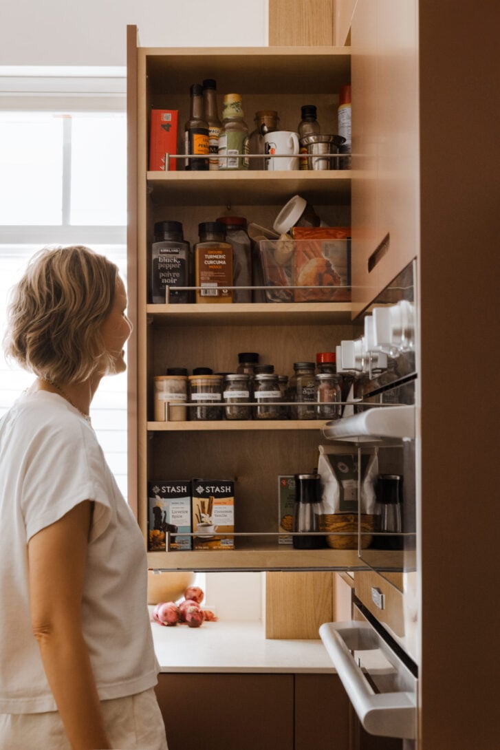 The pull-out pantry is a convenient place to store the couple’s spices and oils, and, thanks to a six-inch dummy panel directly below, opening the door won’t knock your mixing bowl off the counter.