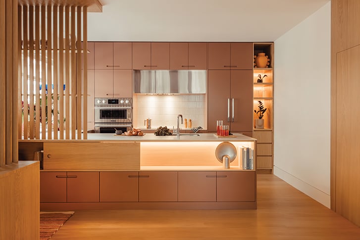 Andrea Jae Studio shows how natural light, dimmable LEDs and light-reflecting paint make muted pink millwork and slat details glow all day. READ MORE