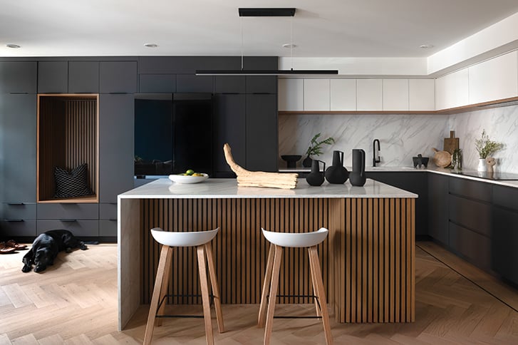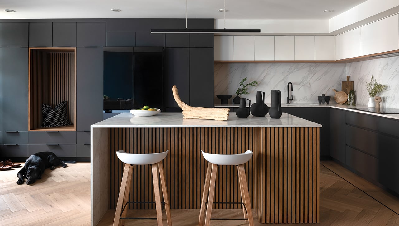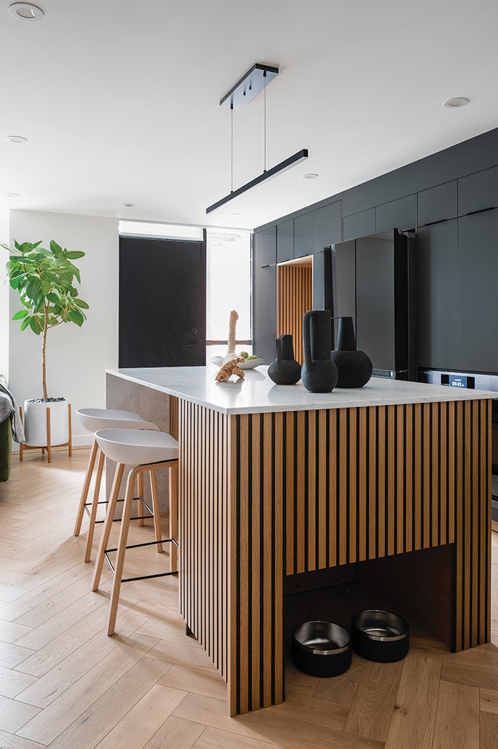 Knocking down walls is easier said than done, especially when said walls contain water lines that are essential for a downtown Vancouver condo. “We weren’t even really sure if we could move them,” says Danielle Molnar, founder and lead interior designer of Accentrix Design. Together with Roka Projects’ Tyler Thorne, the Accentrix team transformed this closed-concept kitchen into an airy, clean-lined space, hiding pipes behind a bulkhead that seamlessly blends into both the white upper cabinetry and matte grey millwork. “The goal was to conceal… and make it look like it was intentional,” Molnar explains. Other subtle details—like vertical white oak panelling on the island, a black inlay framing the herringbone floor and backsplash crafted from playful Calacatta Renoir quartz—provide more linear visual interest, so the bulkhead (and the plumbing) can quietly do its job.