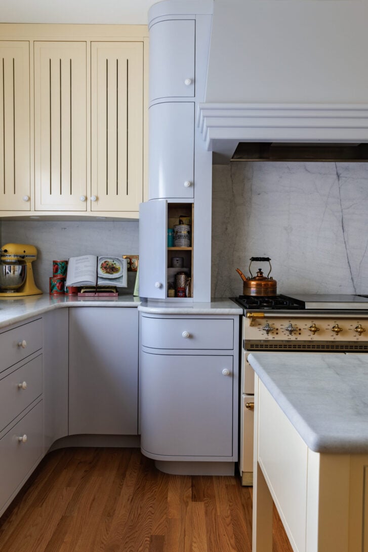 Bidgood bullnosed the edges of the countertops to make for extra curves and dropped some kitschy pendant lights close to the counters to illuminate work surfaces. A large stove with an oversized vent anchors the room—the walls of which, by the way, are painted a gorgeous (and once again trending) butter yellow.