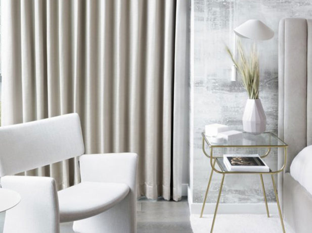 Bedrooms Bedroom We Love: A Sophisticated Silver Retreat Designer trick: Install drapes that blend with the wall colour to create a cozy hideaway.