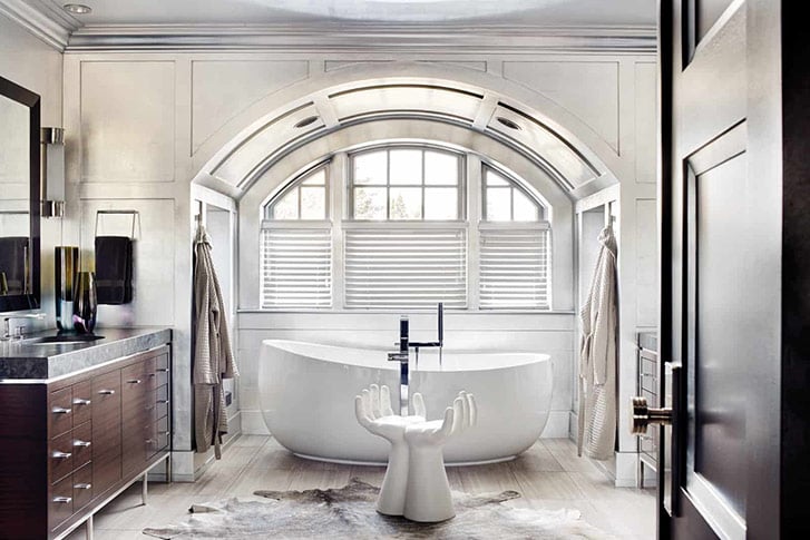 Not for Mitchell’s clients. One home features both a dramatic chair made out of orange seat belts, and a Missoni wall-to-wall carpet featuring stripes of blue, orange and yellow. In another, a master bathroom is completely covered—ceilings, too—in silver leaf. The shower is boldly tiled in grey-and-white plaid.