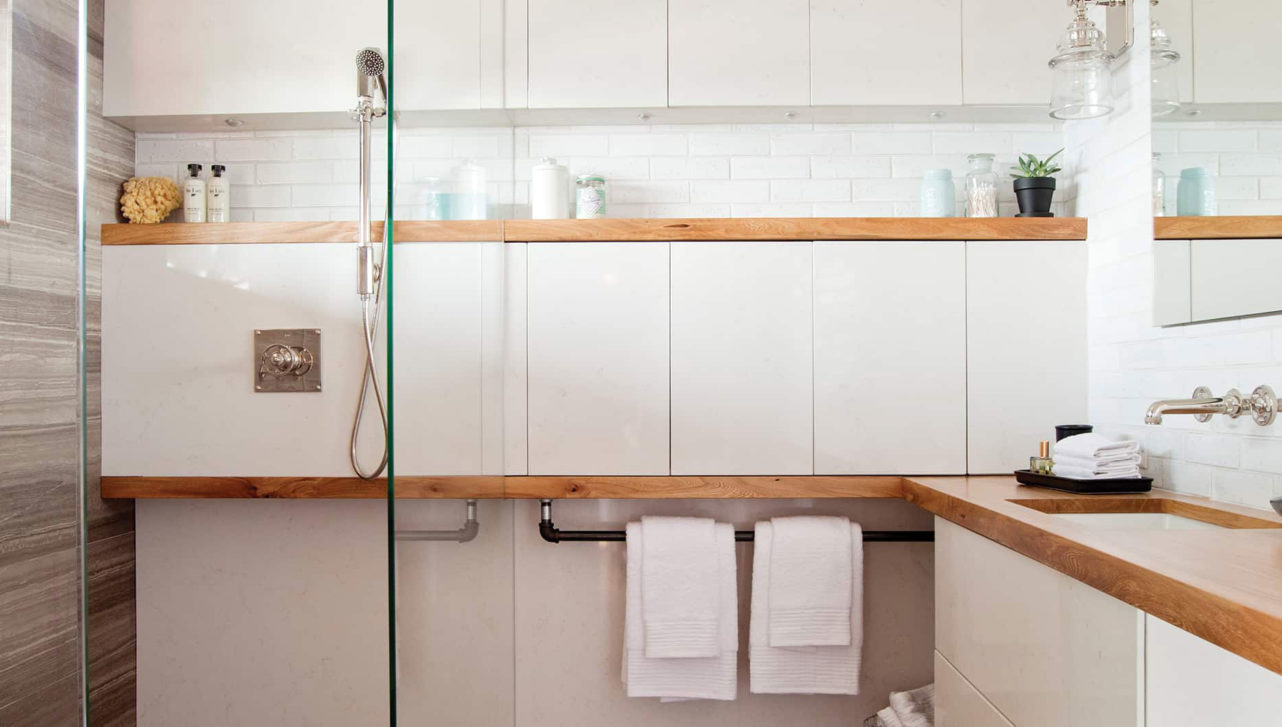 But the hobby renovator always had a design in mind, and when his schedule opened up again he enlisted Vancouver designer Jamie Banfield to help strategize the much-needed storage for his 72-square-foot master bath. Where Talbot had envisioned a flat back wall, Banfield suggested stealing eight inches for two banks of shallow cupboards. This meant either stopping the storage at the shower, or running it through the shower along the whole wall. “We decided to take the more complicated version,” says Talbot.