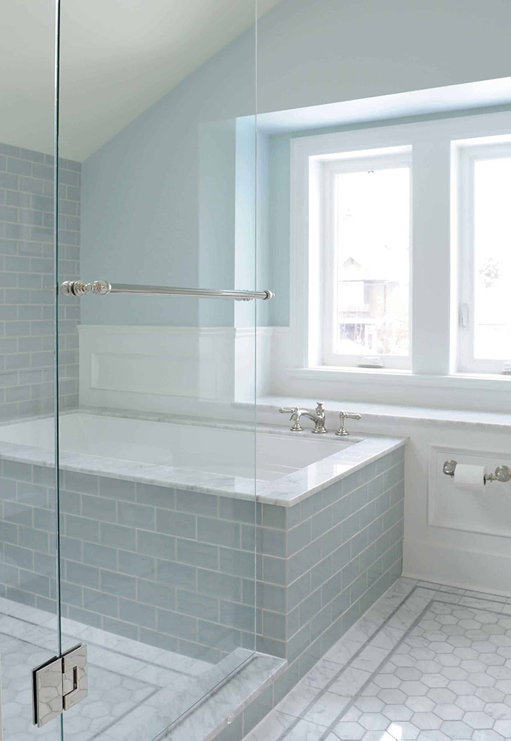 The owners of this newly expanded 1920s house on Vancouver’s west side wanted a master bathroom that referenced the period architecture of the original structure but also incorporated colour. “They are very vibrant people,” says Madeleine Schmidt, principal of Madeleine Schmidt Design, who oversaw the bathroom-design portion of the project. “We found that soft blue subway tile and played off of it, keeping the millwork a contrasting clean, fresh white.” The blue repeats in a coordinating accent tile chosen for the recessed his-and-hers shower niches and continues through to the wall colour—Benjamin Moore’s aptly named Ocean Air. Height restrictions in the shower area led general contractor Jon Pulice of Rain City Renovations to incorporate a skylight directly over the showerhead: all the better to see yet more shades of blue beyond. For the floors, Schmidt layered three patterns of classic Bianco Carrara marble, sourced through Ames Tile, to both delineate the zones of the room and keep the look authentic. “We considered doing a porcelain tile but decided the materials had to be true to the original feel of the house. The homeowners have lived here for almost 20 years. It’s their forever home and they didn’t want to take away from its character.”