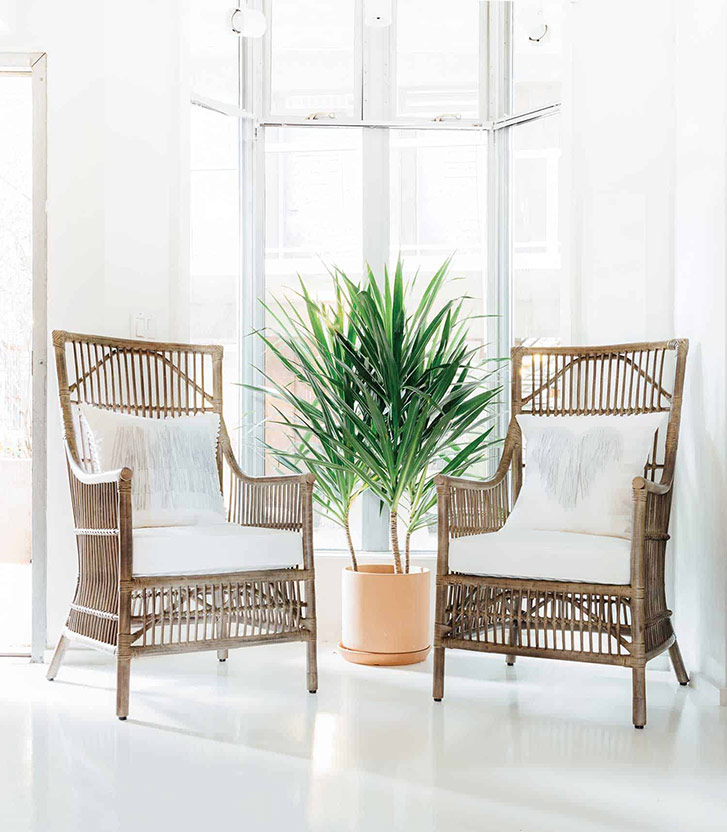 As a designer, Auld naturally has an eye for style, so putting together the interior design of the space was very much instinctive for her. “I like to bring in things that are telling and mean something,” says Auld. “The brand is very influenced by travel. So all of our wall art and everything like that has a very vacation vibe”—right down to the “wish you were here” neon sign by Endeavour Neon and the beaded turquoise lamps that have us dreaming of white sand beaches. Desert-cool cacti appear in both the artwork and in real life next to a pair of rattan chairs.