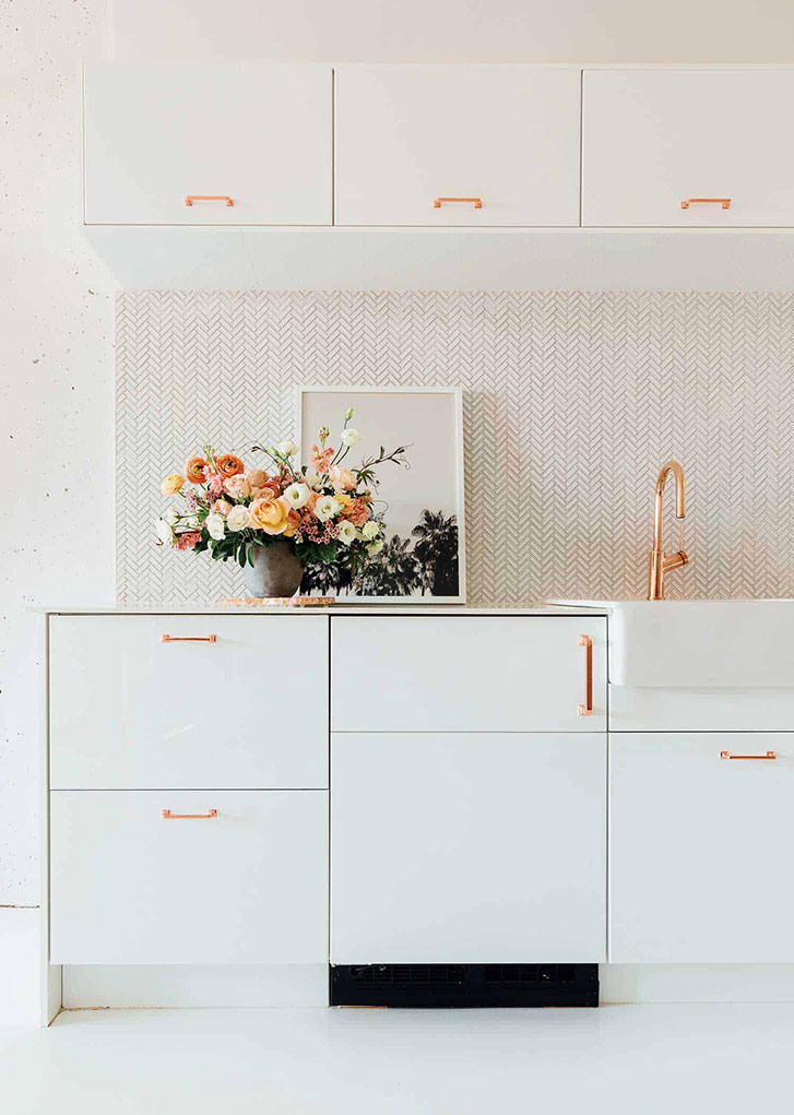 Known for her delicate and minimalist gem-centric pieces, Auld kept the reno as simple as her jewellery designs while pulling in different textures, greenery and soft pastels to elevate the office where she runs the majority of her wholesale and Canadian operations. One prime example: the whitewashed cedar wall in the entryway, which satisfies Auld’s need for a calm, minimal colour palette but also subtly references the tile kitchenette backsplash with its herringbone pattern.