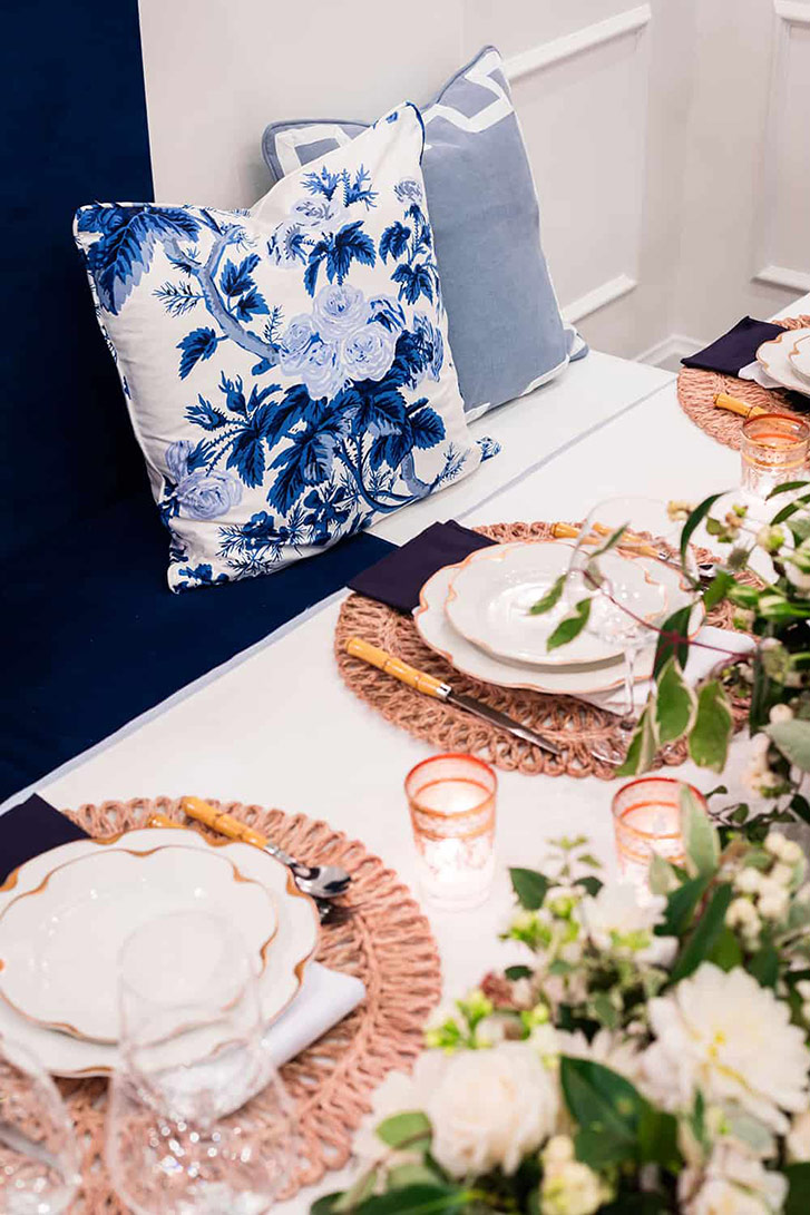 dxdweb3An all-American getaway awaits in this collaborative tablescape from designers Karla Amadatsu and Stephanie Giesbrecht. From the preppy blue-and-white palette and lush foliage to the upholstered banquette and crystal chandelier, the laid-back space exudes a summer-in-the-Hamptons vibe through and through.