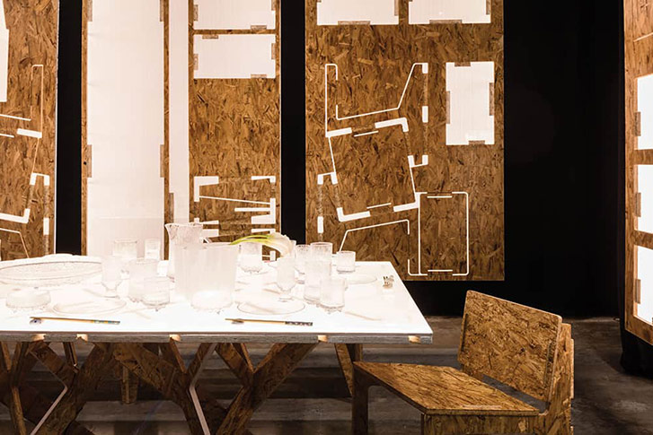 Opt for benches. To accommodate larger parties—and get crowds chatting—reconfigure your space to include benches. Pearson crafted extra-wide seats that fit from three to six diners each.Play with tableware. Textured dinner- and glassware—modelled after melting ice—allows the LED-layered tabletop to shine, but it’s the Japanese chopsticks and cartoonish porcelain holders that add whimsy to mealtime. Leave floors bare. Pearson kept the attention on his ethereal dining table and floating pieces of OSB by forgoing floor coverings. “The table itself was so intense,” he notes. “There was no need to have anything underneath it.”