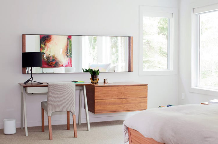 Designer: Falken Reynolds InteriorsHome: Whistler, B.C.This Whistler vacation home sees plenty of visitors come and go, so incorporating a multi-purpose zone in the master bedroom that could be used as either a workspace or a vanity was key for design firm Falken Reynolds. Above a shallow desk and Blu Dot Knicker chair (“Because this is in the bedroom, we brought in a fabric-upholstered piece to keep the space warm and cozy,” explains designer Chad Falkenberg) sits a ledged mirror, which serves a purpose beyond makeup checks: “The homeowner has a great collection of art,” says Falkenberg. “On the opposite wall, we hung a strong piece, so rather than putting a competing piece here, we installed a mirror to reflect it.” And from certain angles, the sightline from the window is visible, too—a gorgeous forest landscape that’s a work of art in its own right.`WL0615.AspenDr_6138.REV