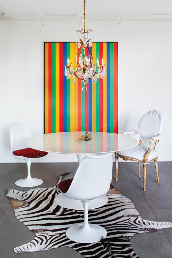 The art in this space may be contemporary (and the gallery wall is constantly being updated with fresh works), but much of the furniture is old school, like the vintage blue leather Knole sofa and chairs, and the classic Saarinen side table. A classic Warhol hangs in the kitchen.ArtGalleryHome-_054DESIGNER TIP: In an art-filled home, keep other elements neutral.