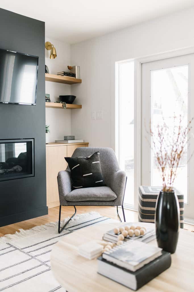 But first: the layout. The bungalow was very compartmentalized, so Lynne and Tidswell took down the walls to open things up and reworked the layout to fit the young couple’s needs. From there, they layered in light woods and rich textures. Cashmere-matte-front cabinets from Kitch (an Edmonton company that transforms Ikea units) created a sense of warmth in the kitchen; the same cabinets were used for custom storage around the fireplace as well, echoing the material palette. White oak kept things light and airy but warm.