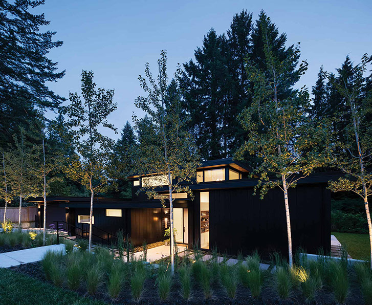 there'sa practical side to that black-on-black metal exterior: the site is located in a wildfire hazard zone, so the majority of the cladding had to be non-combustible. But on the inside, the design team leaned in to a bold, beautiful contrast. €œOn the inside we wanted it to feel bright, open, cheerful, and to exude quality,€ explains architectural designer Mark Simone of Shelter Residential. €œWe were very careful about window placement to capture views while maintaining privacy, and we looked for creative ways to bring natural lighting to the main level.€