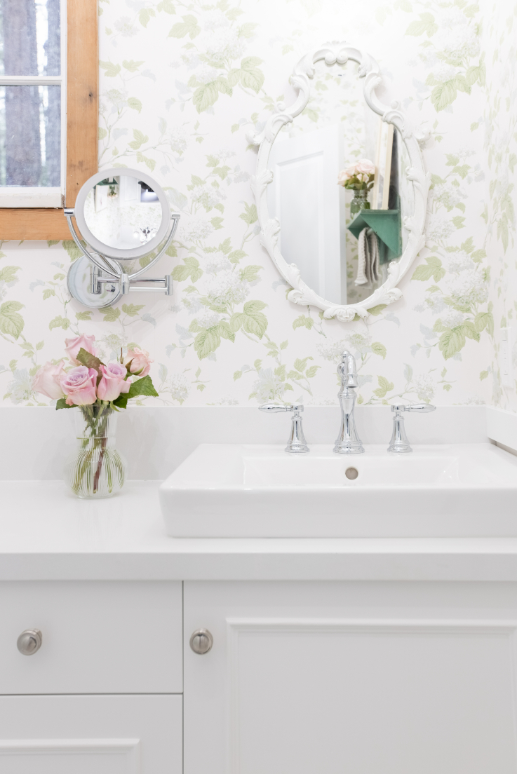 The cabin bathroom has a charming floral wallpaper.