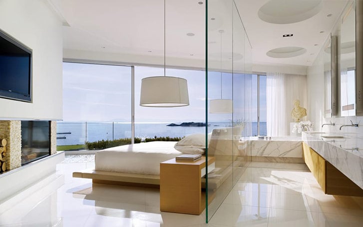 Living the dream doesn’t always mean elephantine mansions. Yes, the owners of this West Vancouver beach house do own a much larger Arthur Erickson-designed house a little ways up the hillside. And yes, they’ve also bought up four adjoining properties, the better to fill their idealized perimeter with gardens and waterfalls. But the homeowners have found that a manageable, intimate space can provide a lifestyle that larger spaces would smother. In 2004, Erickson worked with architect Nick Milkovich to design the base floor of the beach house—it’s a party zone, reached via funicular from the main house, and it has certain hallmarks of Erickson’s playboy heyday: there’s an ’80s-style hedonism to the massive futuristic bar, which consumes much of the space, and an extremeness to its all-white interior.When owner John Laxton met interior designer Mitchell Freedland at a party in 2005, he brought him on board to create a compact living space above that party den. At a mere 1,250 square feet, the beach house’s upper floor was intended as a secondary suite. Nobody knew then that the owners would love it so much they would practically move in, largely forsaking the capacious building up the hill.MarineDrive-107 MarineDrive-092 MarineDrive-073What is so inviting about the room Freedland delivered? (And it is essentially a single room.) He managed to draw in the elements—the ever-present ocean, expanses of broadly terraced, wondrously manicured lawns—while giving the abode a measure of warmth and security, too. “Because things were going to be so focused on that great view, we wanted to create an anchor at the back wall,” says Freedland. A bank of closets was fashioned from rift-cut white oak. The sandy tones, featured there and in a stack of (decorative) logs by the gas fireplace, reference the beach, of course, but also work to warm up an otherwise all-white space. The custom bed sits parallel to the trapezoidal angle that animates one side of the beach house—all of which nudges sleepy-eyed residents to take in ocean views. Walk toward that wall of windows and the anchoring of the building’s rear starts to shimmer and break up; an original glass block skylight that was installed on the lower level is now a transparent walkway for the top floor.It’s a balancing act between safety and freedom; you’re held tight in the curtain-ensconced dressing room, which sits beyond a pair of white oak doors, or your hair is whipped by ocean breezes as you step onto the patio and into an ocean-wide vista. And there’s another balancing act at play, too. Everything floats a little. The volume of the fireplace hovers off the floor; the large custom sofa was lifted, too, and set upon a polished steel plinth, which reflects the flooring, giving the illusion that the floor continues under the sofa. But, again, Freedland anchors you when you need it. The marble jetted tub may have a subtle toe-kick to keep things buoyant, but its sculptural mass is necessary for true relaxation. Overlooking bathers is a bust of the Roman emperor Hadrian (he was a developer, too, like the homeowner) who gives his own counterpoint of gravitas to the otherwise strictly contemporary interior. Children and pets are known to need small, controllable spaces in order to feel safe. They like dens and secret hideaways under the stairs. But there’s a childlike pleasure we can all experience in an adult (and luxurious) variation on that theme. Freedland’s beach house does away with the weighty baggage that so often goes along with “dream” homes, leaving his clients to pare things down, commune with the elements, or simply hibernate. Standing out on the patio one can consider the private cove. In the middle distance, there’s a naked rockform called Seal’s Island; jutting in that direction is a miniature man-made peninsula, as precisely manicured as the rest of the lower lawns. A pair of baroque figurines guard the circular platform at the end of it. Do the homeowners take tea down there? It seems an ideal setting. “No,” comes the reply, with a surprised smile at the idea. In fact “the breakwater” will be expanded and further landscaped—they’re waiting for the next designer to present them with options. Then there’s a grin again, as though to say it’s still okay to dream big.MarineDrive-024 MarineDrive-011 MarineDrive-163 MarineDrive-146