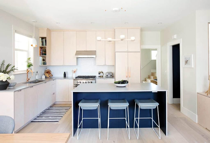 As the design evolved, Joe and Louise carefully avoided choosing anything that fell into a stereotype—like mid-century furnishings. “We didn’t want to fall into the trap of making the home feel like something it wasn’t,” explains Joe. The kitchen cabinetry was an unconventional solution: “We always wanted to do something in birch plywood,” explains McLean, “but we didn’t want the cabinets to end up with that ‘kindergarten yellow’ tone so often associated with public school classrooms.”