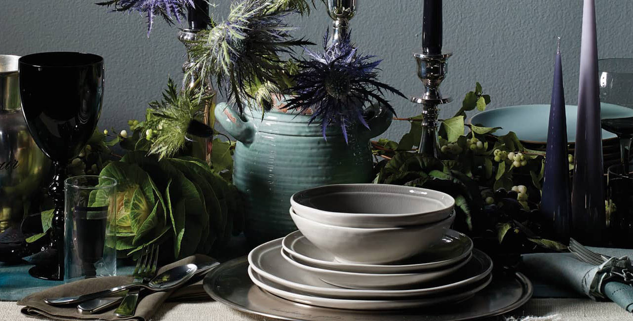 1113-variations-on-a-feast_holiday-recipes-05What good is toiling away in the kitchen if your well-planned feast lands on a table that has disposable napkins from your local fast food chain. We’ve enlisted resident stylist Nicole Sjöstedt to create a look that will set the perfect festive stage.1. Go Au Naturel—Turnips, kale and artichokes give an organic shot of colour from an unexpected source.2. Mix in Metallics—Pewter or antique silver pieces are a natural complement to the minty blue of the ceramic plates.3. Cool The Colour Palette—Dark blue evokes the crisp cold of winter but is muted enough as to not overpower the table.4. Add Height—Long tapered candles lend both an elegance and a sense of occasion to a table.5. Bring in the Handmade—Ceramic plates and bowls bring a soft earthy feeling to this setting and they have that quirky one-of-a-kind feel.6. Bring it Back—Above all, this table setting is versatile—it could work equally well for Christmas, Hanukkah or New Year’s.