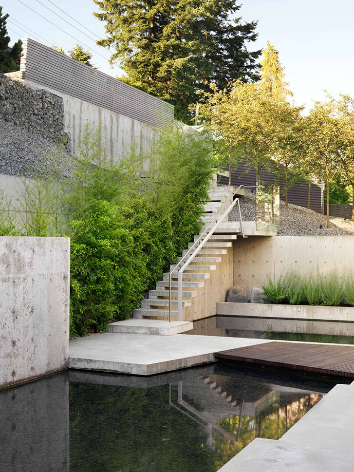 The quiet Sentinel Hill neighbourhood is tucked neatly up the mountainside at the entrance to West Vancouver—it’s always been an ideal place to escape without quite retreating. Several houses here are small, mid-century gems designed by Ron Thom and his circle; almost all are screened behind vegetation. But locals know this is also a launch pad—in a minute they can be cruising into downtown along the arc of the Lions Gate Bridge.It made perfect sense to designers Matthew McLeod and Lisa Bovell (of McLeod Bovell) when their young, educated clients chose this site for their new home. “They’re entrepreneurs,” explains McLeod. “They need to be involved in day-to-day business, but they also have a very private and religious life, so they needed this house to let them do both. That’s the drive for this building.” The home would be a gathering place for their religious community as well as for themselves—to be an expression of both their personal and public spiritual lives.Still Reflections Pools of water maximize light in the home’s front and backyards. The concrete patio out back (above) includes an infinity pool that seems to be suspended over the neighbourhood. The entrance to the front door (opposite top) is an asymmetrical collage of beams and concrete gilded with bouncing sunlight from the pond. Cantilevered stairs (opposite bottom) descend from street level, delivering visitors to a well of light and water. Still Reflections