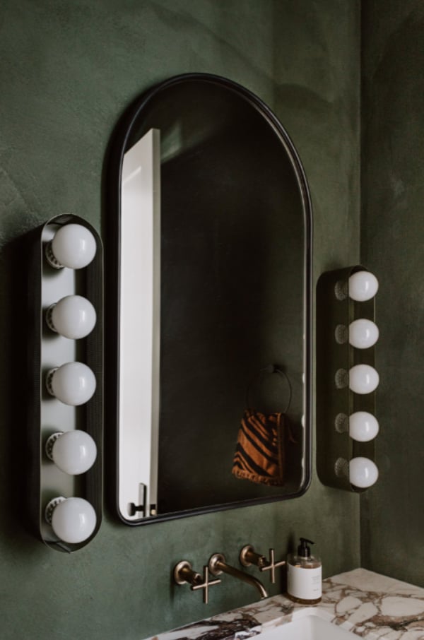 The same marble from the fireplace is repeated in the bathroom, complementing the forest-green plaster walls. “Hollywood” lights illuminate the mirror. “We didn’t want it to be a super feminine house, but those lights do play into the feminine side of design,” says Hughes.