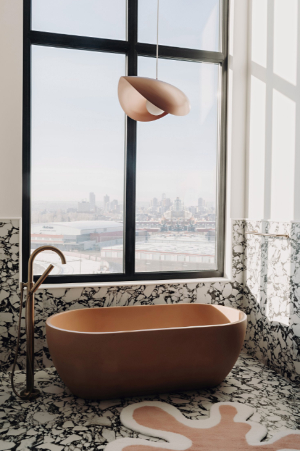 The concrete bathtub is from Nood Co; it’s a gorgeous blush-nude hue that seems to glow against the Stone Tile porcelain tile that lines the floors and walls. The light fixtures come from Montreal’s Luinarir. The intense black veining adds drama but also serves a practical function: “We wanted a tile that would hide hair,” laughs Hughes.