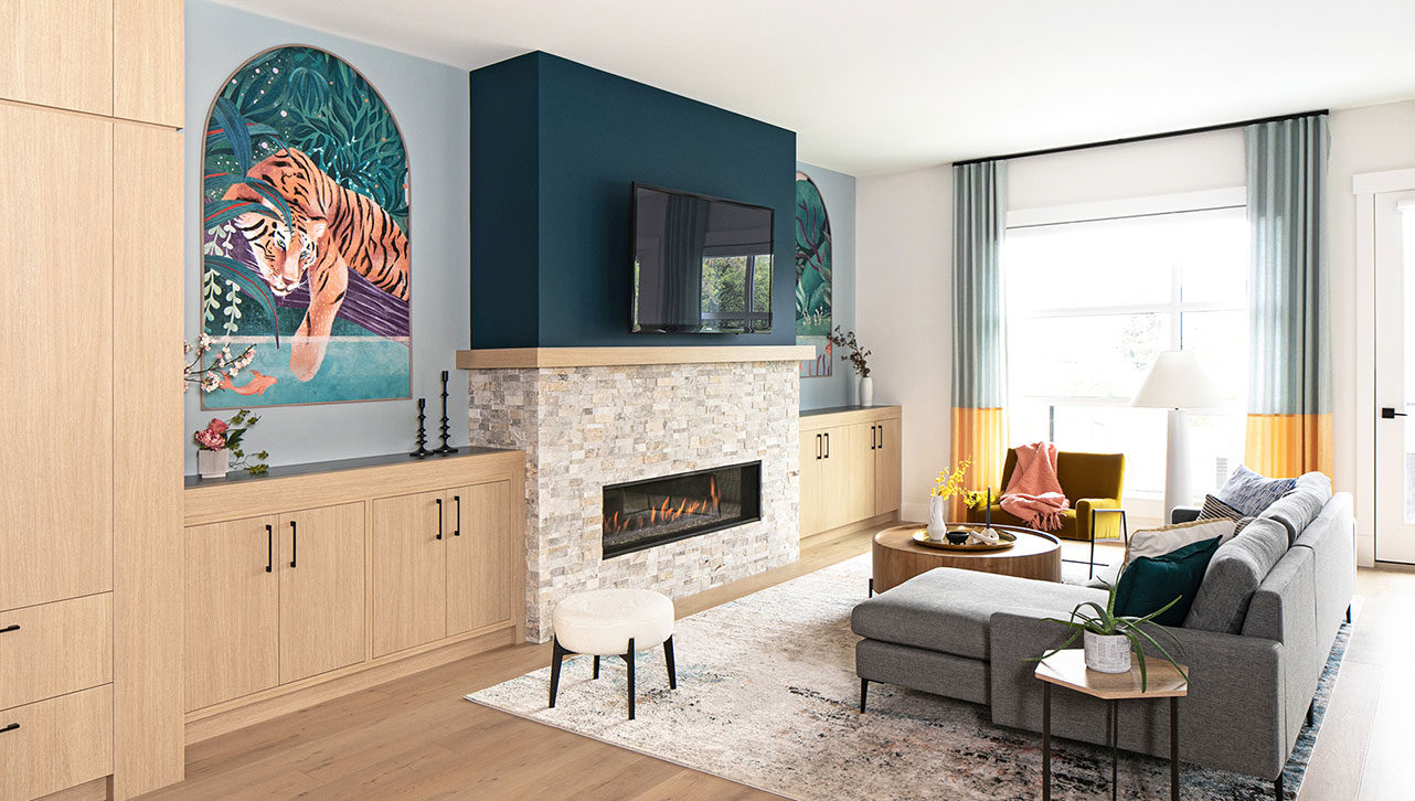 A custom illustrative mural of a tiger is the focal point of the living room, playing on the client’s love for cats. To keep the space balanced, it was skillfully divided into two parts and installed on wood panels that matched the existing cabinetry. The arched design of the panels ties-in with the big and bold colour-block arches on the wall of the dining room.
