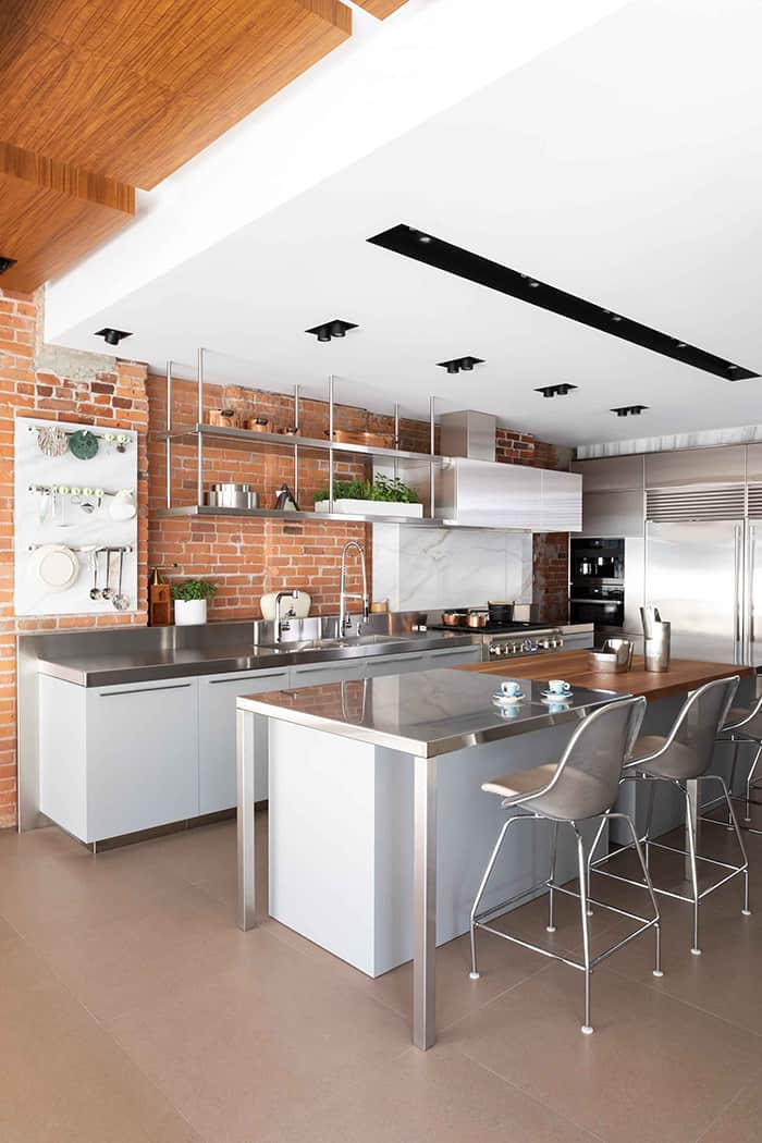 Exposed original brick lines the back wall of the kitchen, and the team was careful to protect it by hanging shelves and cabinetry from the ceiling, rather than directly onto the brickwork itself. Stainless steel counters in front of the wall also rise up into a low ledge, which levels out the uneven wall face and provides space for a toaster and planters for kitchen herbs.