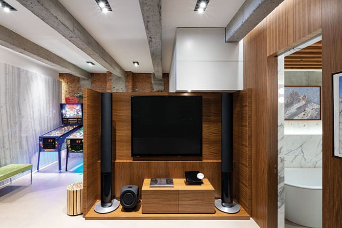 In the main living space, the original fireplace was a typical drywall box, but the team at Falken Reynolds wanted the new iteration to feel almost as if it was a freestanding piece of furniture. Its asymmetrical design of black-flamed granite, cold-rolled steel and travertine became the inspiration for a re-envisioning of the entire suite. From the nearby home bar and media centre to the kitchen and home theatre, each installation in the space is made to feel like its own standalone unit.