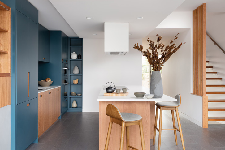 The hood fan is quiet on two fronts: the Faber fan will quietly sweep away cooking odours, and it’s designed to be visually quiet, with a white drywall enclosure. “The central fan is a function of having your cooktop on the island, but by keeping it white, crisp and clean, it’s not where your eye is drawn,” says Ewanchyna. “Instead it’s drawn to the back, to the warm cherry and teal.” Photo: Barbara Tili