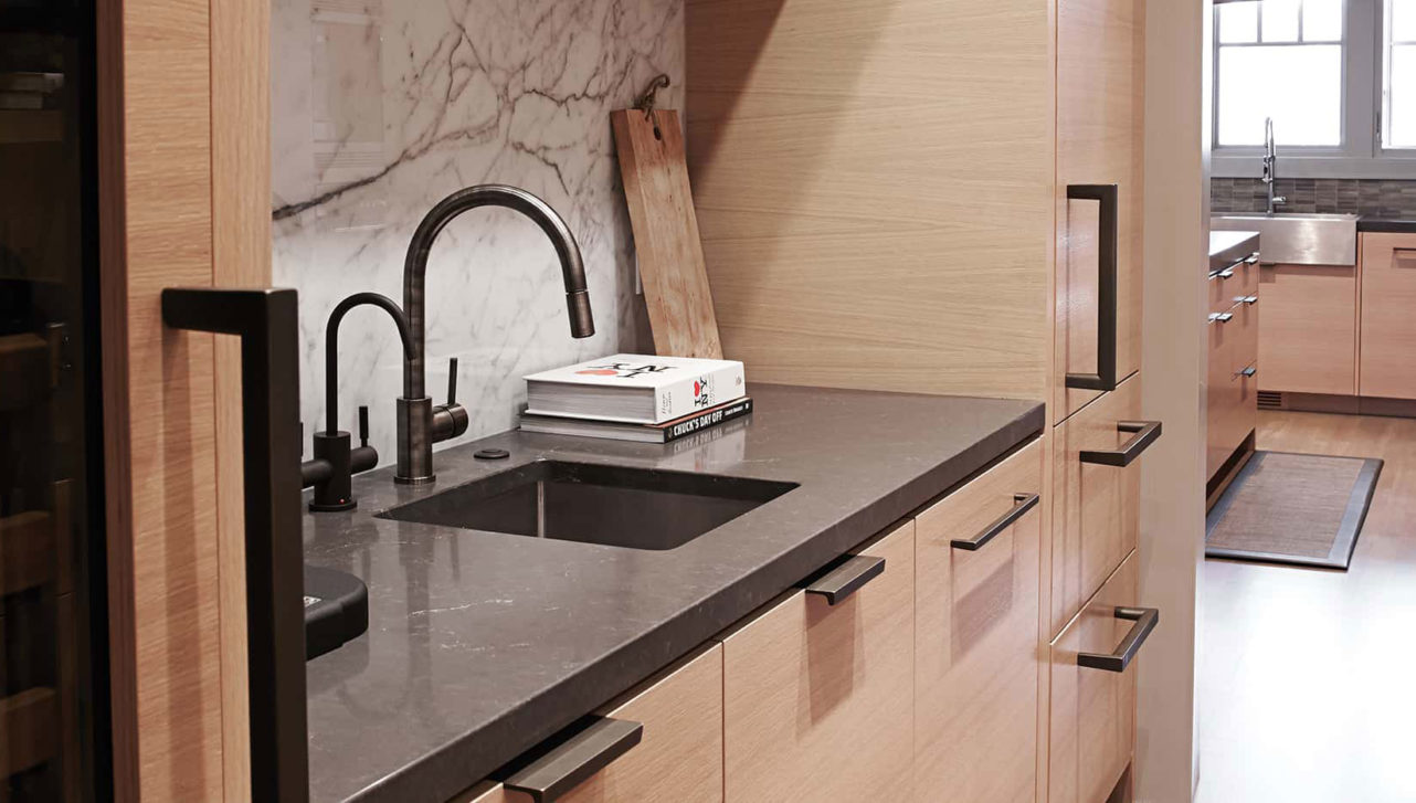 The stairwell, located right next to the kitchen, is painted dark grey, so designer Denise Ashmore chose a matching charcoal engineered-quartz Caesarstone tile to act as both the backsplash and countertop material. “When you turn the under-cabinet lights off, the backsplash becomes an extension of the stairwell wall colour and disappears,” she says.MORE: Check out the full story on this modern kitchen design.art
